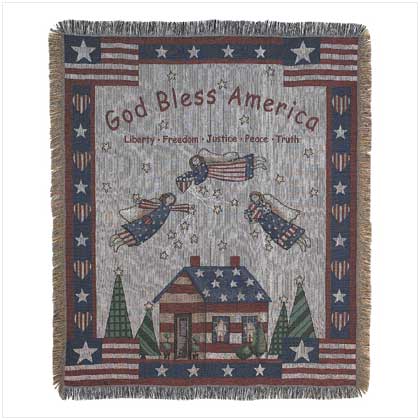 Brighten any room with a proud proclamation of old-fashioned patriotism! Nostalgic throw blanket is bordered with colorful stars, stripes and hearts; at its very center, a trio of angels showers armloads of blessings upon a cozy country cabin. Lightweight weave is just right for snuggling on an autumn night. 100% Cotton. Machine wash cold; tumble dry low. 50" x 60" high.