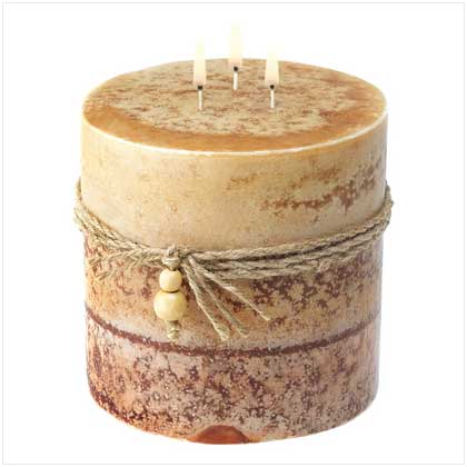 Stacked layers of mottled caramel colors lend a delicious warmth to an impressively proportioned pillar candle! Simple and rustic, yet utterly sophisticated, this everlasting triple-wick candle gets extra artistry from genuine beaded rope trim. Pleasing spiced wood fragrance soothes the air with a subtle perfume. Burns up to 90 hours. Paraffin wax. 6" diameter x 6" high.