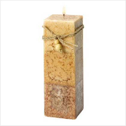 Simple and rustic, yet utterly sophisticated, this sumptuous candle gets extra artistry from genuine beaded rope trim. Pleasing spiced wood fragrance soothes the air with a subtle perfume. Burns up to 30 hours. Paraffin wax. 3" square x 9" high.