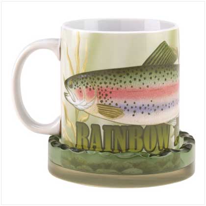 Any avid angler is sure to appreciate this handsomely embellished mug, complete with its own clear coaster! Beautiful rainbow trout motif is sure to start many a conversation. Weight 1.7 lbs. Ceramic mug and resin holder. Mug: microwave and dishwasher safe; holder: hand wash only. P65 Mug: 3?" diameter x 4¬" high; coaster: 4?" diameter x 1" high.