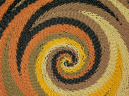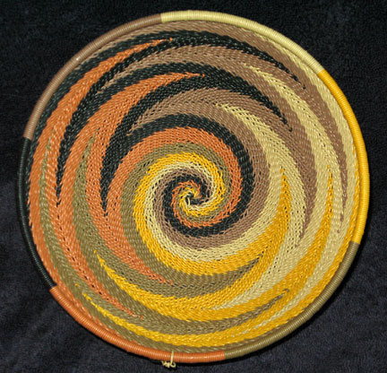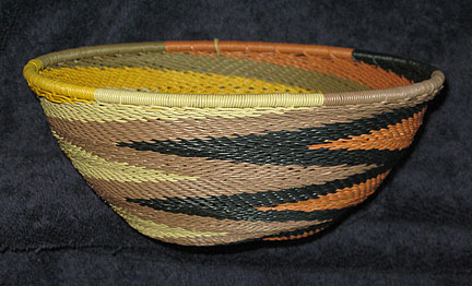 "The telephone wire basket is a relatively recent craft development which reflects the ingenuity of craftspeople. Brightly coloured telephone wires are used to great creative effect, decoratively covering objects such as bottles and walking sticks, or made into plates and baskets."