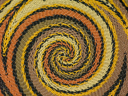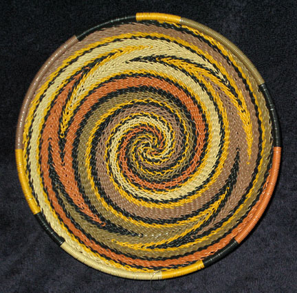 "The telephone wire basket is a relatively recent craft development which reflects the ingenuity of craftspeople. Brightly coloured telephone wires are used to great creative effect, decoratively covering objects such as bottles and walking sticks, or made into plates and baskets."