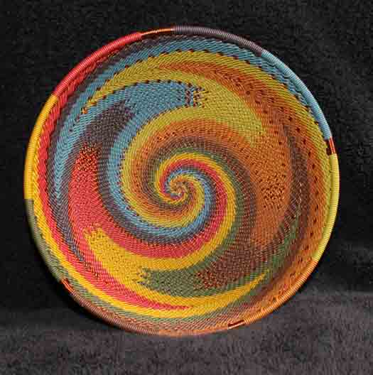 "The telephone wire basket is a relatively recent craft development which reflects the ingenuity of craftspeople. Brightly coloured telephone wires are used to great creative effect, decoratively covering objects such as bottles and walking sticks, or made into plates and baskets."