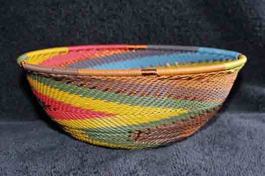 Telephone baskets are very popular and hard to find. Each one is unique. They are solidly made and heavy. This basket is made of recycled telephone wire and has vivid colors. It has a lovely shape. Marvel at the talent used to make this true work of usable art. Wash with warm soapy water! A very pretty bowl-shaped basket! It is also wonderfully crafted. Compare the quality and even technique of our telephone wire bowls to others. Extraordinary!