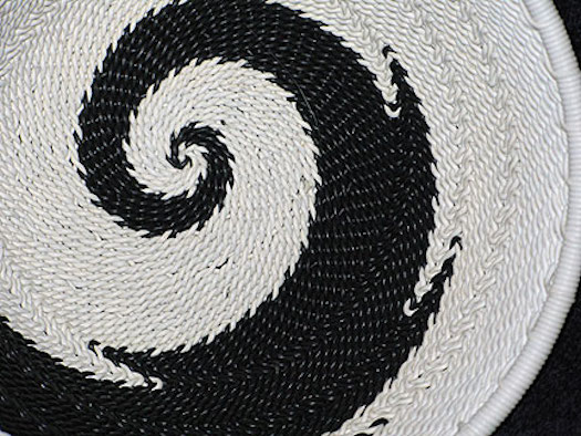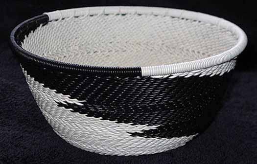 "The telephone wire basket is a relatively recent craft development which reflects the ingenuity of craftspeople. Brightly coloured telephone wires are used to great creative effect, decoratively covering objects such as bottles and walking sticks, or made into plates and baskets."