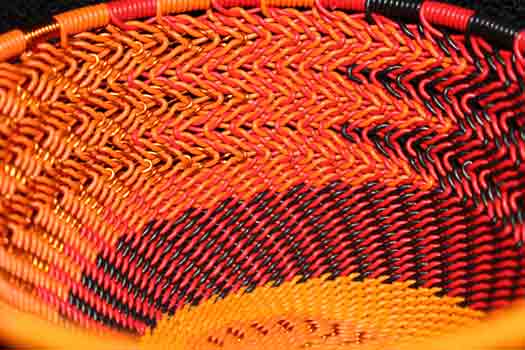 "The telephone wire basket is a relatively recent craft development which reflects the ingenuity of craftspeople. Brightly coloured telephone wires are used to great creative effect, decoratively covering objects such as bottles and walking sticks, or made into plates and baskets."