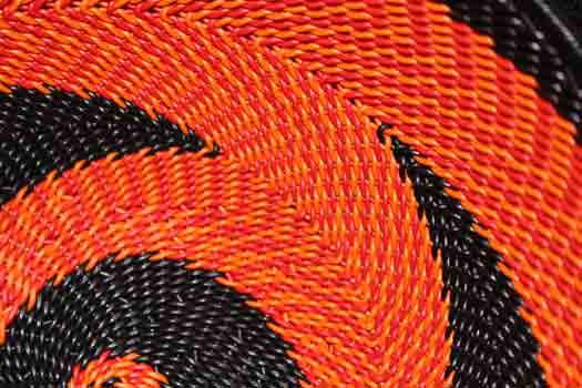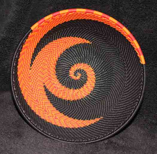 "The telephone wire basket is a relatively recent craft development which reflects the ingenuity of craftspeople. Brightly coloured telephone wires are used to great creative effect, decoratively covering objects such as bottles and walking sticks, or made into plates and baskets."