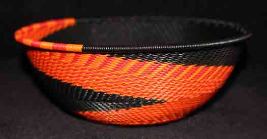Telephone baskets are very popular and hard to find. Each one is unique. They are solidly made and heavy. This basket is made of recycled telephone wire and has vivid colors. It has a lovely shape. Marvel at the talent used to make this true work of usable art. Wash with warm soapy water! A very pretty bowl-shaped basket! It is also wonderfully crafted. Compare the quality and even technique of our telephone wire bowls to others. Extraordinary!