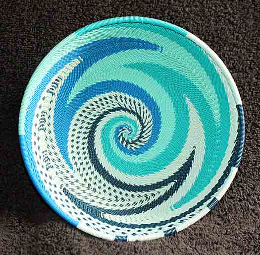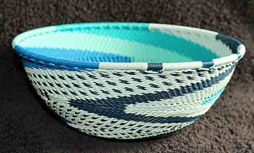 Telephone baskets are very popular and hard to find. Each one is unique. They are solidly made and heavy. This basket is made of recycled telephone wire and has vivid colors. It has a lovely shape. Marvel at the talent used to make this true work of usable art. Wash with warm soapy water! A very pretty bowl-shaped basket! It is also wonderfully crafted. Compare the quality and even technique of our telephone wire bowls to others. Extraordinary!