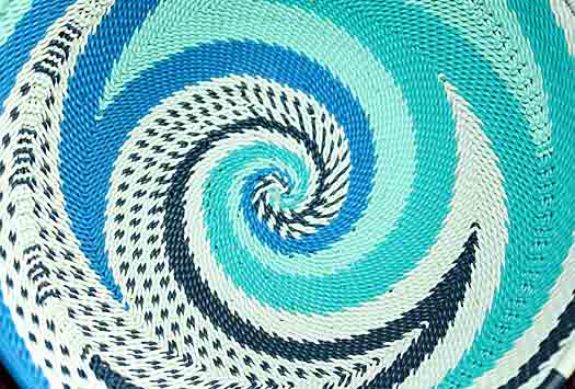 "The telephone wire basket is a relatively recent craft development which reflects the ingenuity of craftspeople. Brightly coloured telephone wires are used to great creative effect, decoratively covering objects such as bottles and walking sticks, or made into plates and baskets."