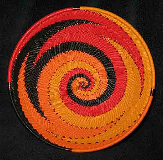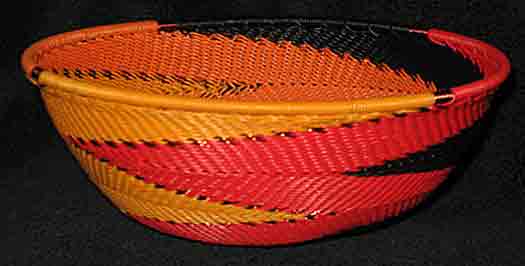 "The telephone wire basket is a relatively recent craft development which reflects the ingenuity of craftspeople. Brightly coloured telephone wires are used to great creative effect, decoratively covering objects such as bottles and walking sticks, or made into plates and baskets."