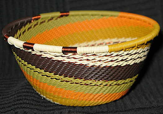 "The telephone wire basket is a relatively recent craft development which reflects the ingenuity of craftspeople. Brightly coloured telephone wires are used to great creative effect, decoratively covering objects such as bottles and walking sticks, or made into plates and baskets."