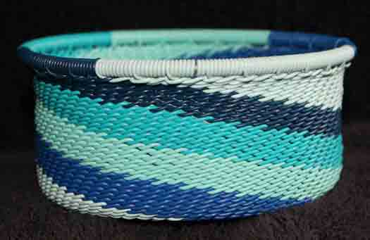 Telephone baskets are very popular and hard to find. Each one is unique. They are solidly made and heavy. This basket is made of recycled telephone wire and has vivid colors. It has a lovely shape.pMarvel at the talent used to make this true work of usable art. Wash with warm soapy water! A very pretty bowl-shaped basket! It is also wonderfully crafted. Compare the quality and even technique of our telephone wire bowls to others. Extraordinary!