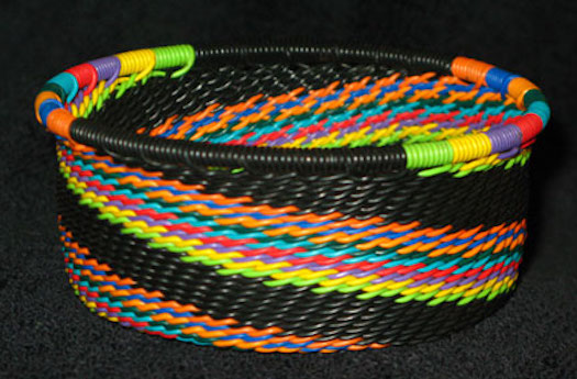 "The telephone wire basket is a relatively recent craft development which reflects the ingenuity of craftspeople. Brightly coloured telephone wires are used to great creative effect, decoratively covering objects such as bottles and walking sticks, or made into plates and baskets."