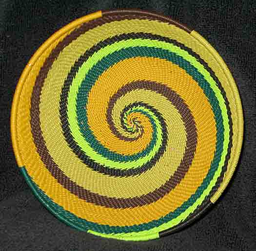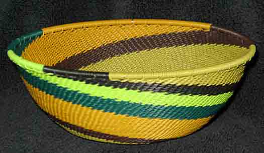 "The telephone wire basket is a relatively recent craft development which reflects the ingenuity of craftspeople. Brightly coloured telephone wires are used to great creative effect, decoratively covering objects such as bottles and walking sticks, or made into plates and baskets."