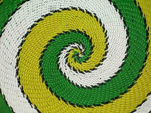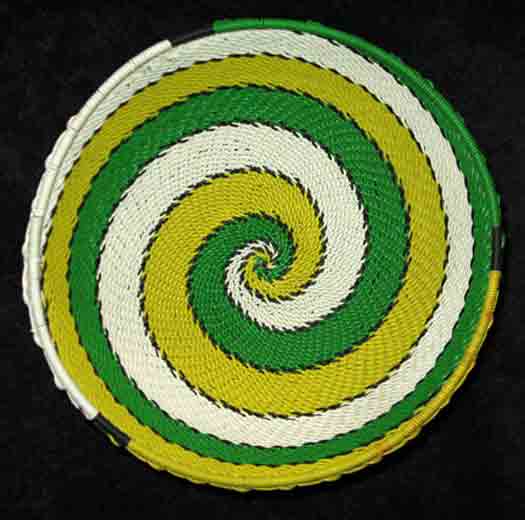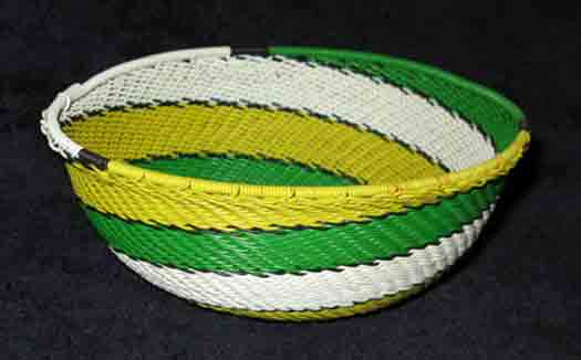 "The telephone wire basket is a relatively recent craft development which reflects the ingenuity of craftspeople. Brightly coloured telephone wires are used to great creative effect, decoratively covering objects such as bottles and walking sticks, or made into plates and baskets."