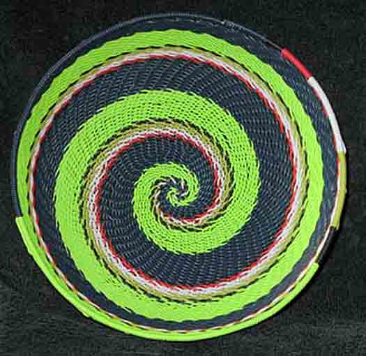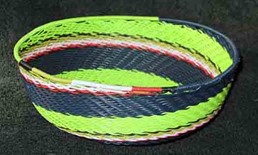 Telephone baskets are very popular and hard to find. Each one is unique. They are solidly made and heavy. This basket is made of recycled telephone wire and has vivid colors. It has a lovely shape. Marvel at the talent used to make this true work of usable art. Wash with warm soapy water! A very pretty bowl-shaped basket! It is also wonderfully crafted. Compare the quality and even technique of our telephone wire bowls to others. Extraordinary!