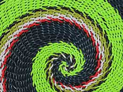 "The telephone wire basket is a relatively recent craft development which reflects the ingenuity of craftspeople. Brightly coloured telephone wires are used to great creative effect, decoratively covering objects such as bottles and walking sticks, or made into plates and baskets."