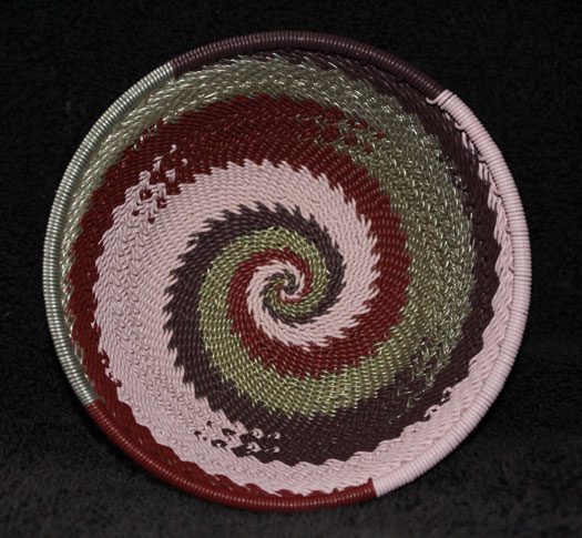 Telephone baskets are very popular and hard to find. Each one is unique. They are solidly made and heavy. This basket is made of recycled telephone wire and has vivid colors. It has a lovely shape. Marvel at the talent used to make this true work of usable art. Wash with warm soapy water! A very pretty bowl-shaped basket! It is also wonderfully crafted. Compare the quality and even technique of our telephone wire bowls to others. Extraordinary!