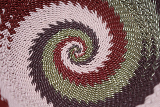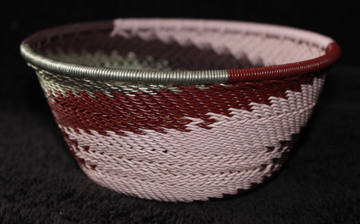 "The telephone wire basket is a relatively recent craft development which reflects the ingenuity of craftspeople. Brightly coloured telephone wires are used to great creative effect, decoratively covering objects such as bottles and walking sticks, or made into plates and baskets."
