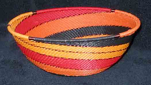 "The telephone wire basket is a relatively recent craft development which reflects the ingenuity of craftspeople. Brightly coloured telephone wires are used to great creative effect, decoratively covering objects such as bottles and walking sticks, or made into plates and baskets."