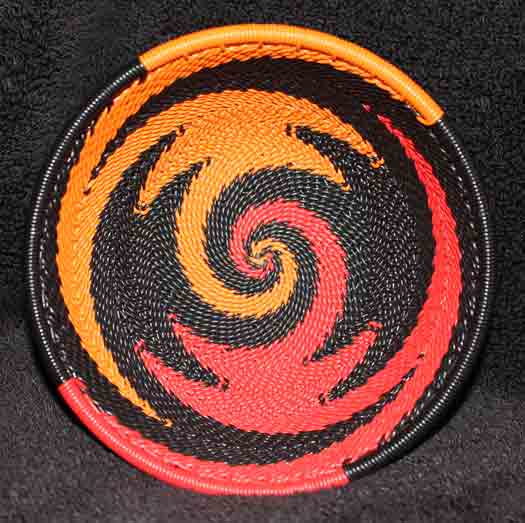 "The telephone wire basket is a relatively recent craft development which reflects the ingenuity of craftspeople. Brightly coloured telephone wires are used to great creative effect, decoratively covering objects such as bottles and walking sticks, or made into plates and baskets."