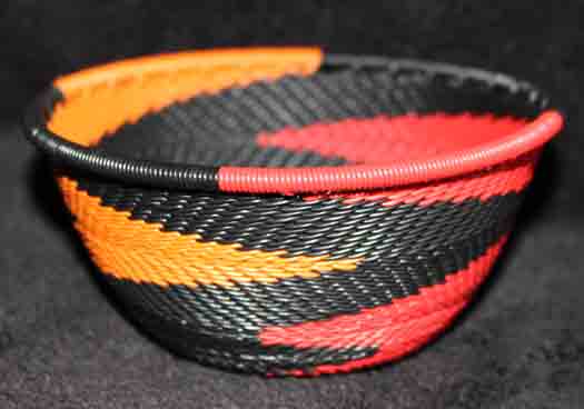 Telephone baskets are very popular and hard to find. Each one is unique. They are solidly made and heavy. This basket is made of recycled telephone wire and has vivid colors. It has a lovely shape. Marvel at the talent used to make this true work of usable art. Wash with warm soapy water! A very pretty bowl-shaped basket! It is also wonderfully crafted. Compare the quality and even technique of our telephone wire bowls to others. Extraordinary!