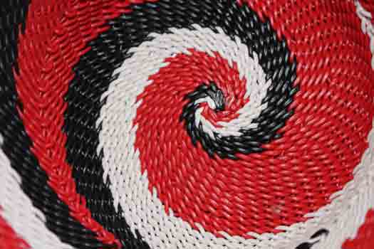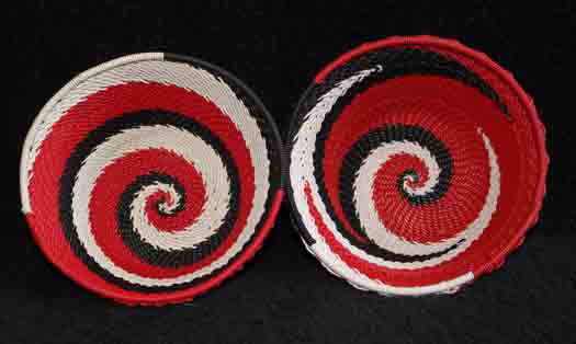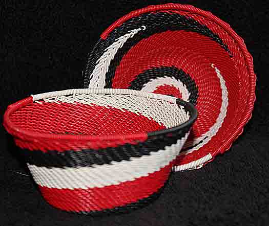 "The telephone wire basket is a relatively recent craft development which reflects the ingenuity of craftspeople. Brightly coloured telephone wires are used to great creative effect, decoratively covering objects such as bottles and walking sticks, or made into plates and baskets."