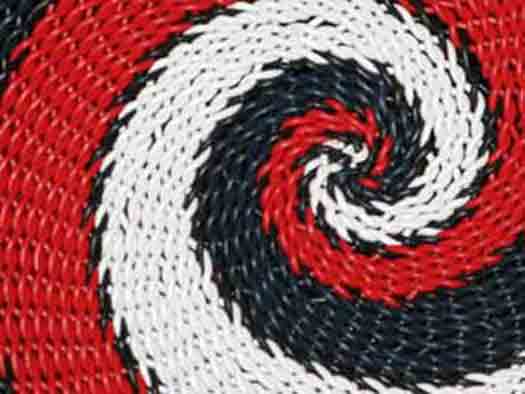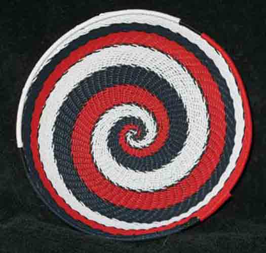 "The telephone wire basket is a relatively recent craft development which reflects the ingenuity of craftspeople. Brightly coloured telephone wires are used to great creative effect, decoratively covering objects such as bottles and walking sticks, or made into plates and baskets."