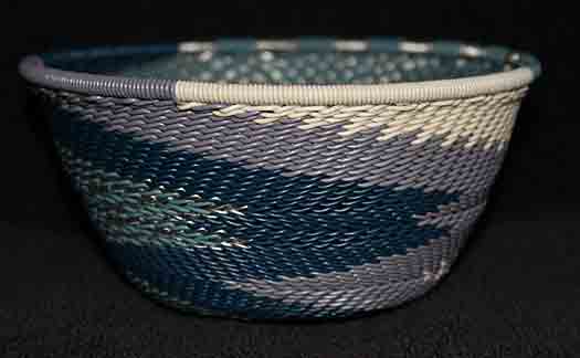 "The telephone wire basket is a relatively recent craft development which reflects the ingenuity of craftspeople. Brightly colored telephone wires are used to great creative effect, decoratively covering objects such as bottles and walking sticks, or made into plates and baskets."