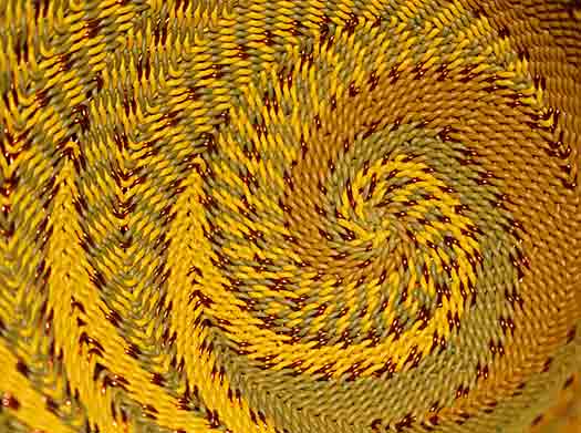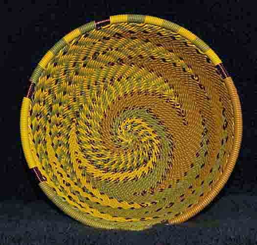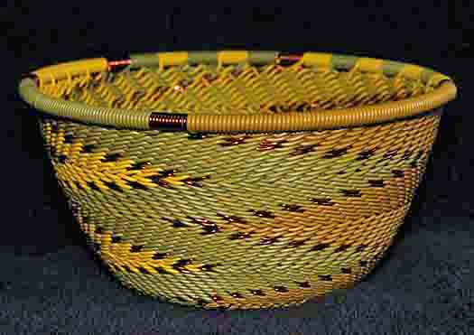 "The telephone wire basket is a relatively recent craft development which reflects the ingenuity of craftspeople. Brightly colored telephone wires are used to great creative effect, decoratively covering objects such as bottles and walking sticks, or made into plates and baskets."