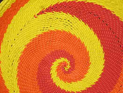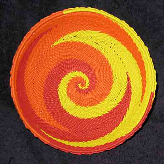 "The telephone wire basket is a relatively recent craft development which reflects the ingenuity of craftspeople. Brightly coloured telephone wires are used to great creative effect, decoratively covering objects such as bottles and walking sticks, or made into plates and baskets."