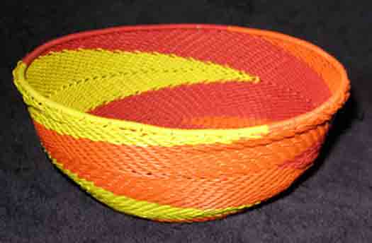 Telephone baskets are very popular and hard to find. Each one is unique. They are solidly made and heavy. This basket is made of recycled telephone wire and has vivid colors. It has a lovely shape. Marvel at the talent used to make this true work of usable art. Wash with warm soapy water! A very pretty bowl-shaped basket! It is also wonderfully crafted. Compare the quality and even technique of our telephone wire bowls to others. Extraordinary!