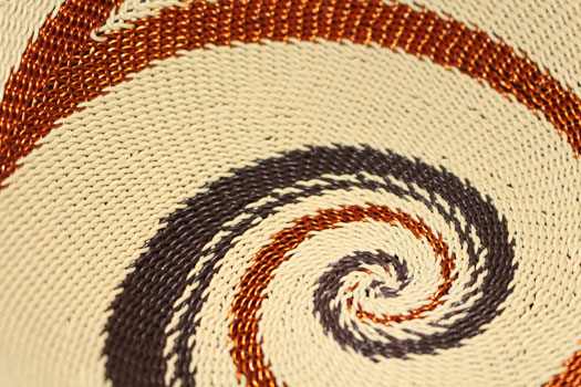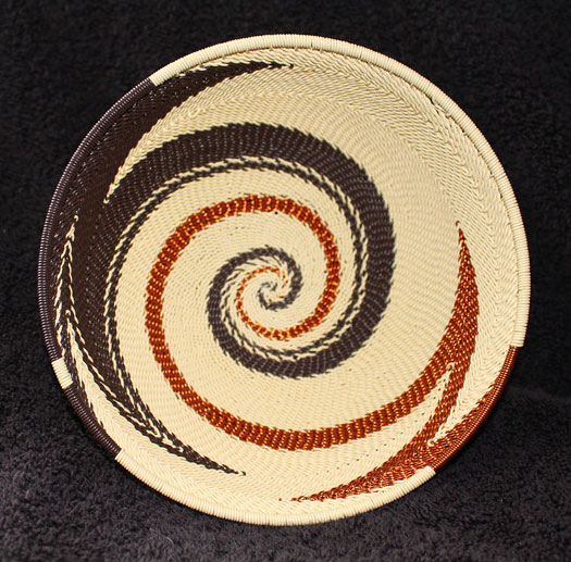 "The telephone wire basket is a relatively recent craft development which reflects the ingenuity of craftspeople. Brightly coloured telephone wires are used to great creative effect, decoratively covering objects such as bottles and walking sticks, or made into plates and baskets."