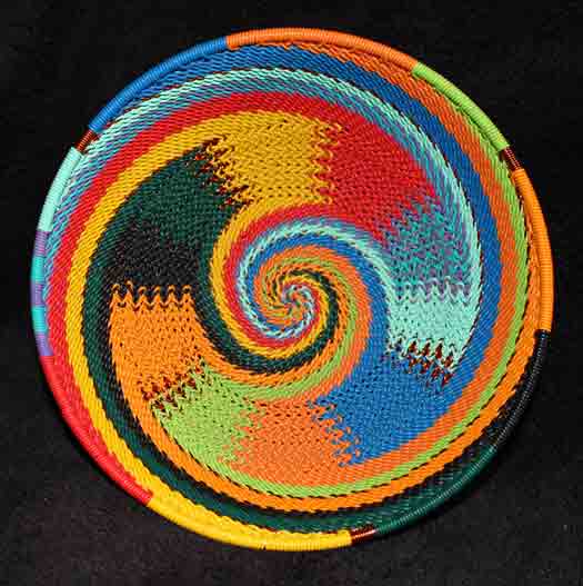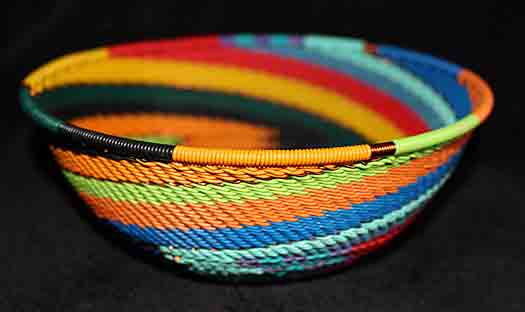 Telephone baskets are very popular and hard to find. Each one is unique. They are solidly made and heavy. This basket is made of recycled telephone wire and has vivid colors. It has a lovely shape. Marvel at the talent used to make this true work of usable art. Wash with warm soapy water! A very pretty bowl-shaped basket! It is also wonderfully crafted. Compare the quality and even technique of our telephone wire bowls to others. Extraordinary!