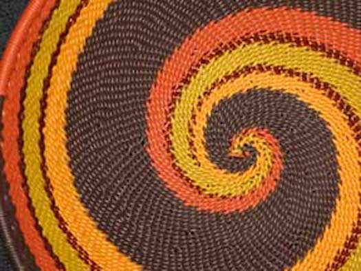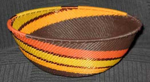 "The telephone wire basket is a relatively recent craft development which reflects the ingenuity of craftspeople. Brightly coloured telephone wires are used to great creative effect, decoratively covering objects such as bottles and walking sticks, or made into plates and baskets."