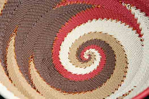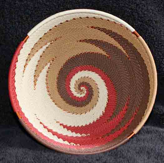"The telephone wire basket is a relatively recent craft development which reflects the ingenuity of craftspeople. Brightly coloured telephone wires are used to great creative effect, decoratively covering objects such as bottles and walking sticks, or made into plates and baskets."
