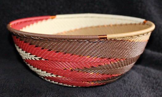 Telephone baskets are very popular and hard to find. Each one is unique. They are solidly made and heavy. This basket is made of recycled telephone wire and has vivid colors. It has a lovely shape. Marvel at the talent used to make this true work of usable art. Wash with warm soapy water! A very pretty bowl-shaped basket! It is also wonderfully crafted. Compare the quality and even technique of our telephone wire bowls to others. Extraordinary!