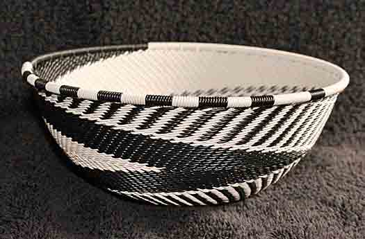 White & Black Feathers - Handmade African Zulu Telephone Wire Basket MED BOWL