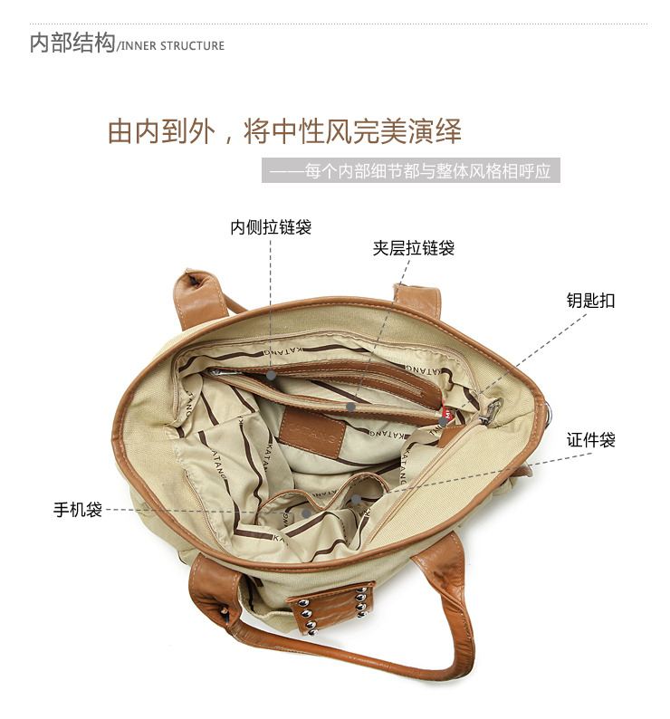 • INTERNAL STRUCTURE:1 outer pocket,1 inside zipper bag, 1 zipper mezzanine,2 inside bag,1 key chain.