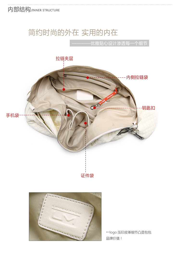 • INTERNAL STRUCTURE:1 outer pocket,1 inside zipper bag, 1 zipper mezzanine,1 key chain,1 change pocket,1 cell phone pocket,1 document pocket.