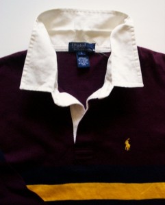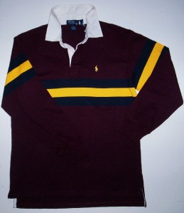 • Styling with three-button hidden contrasting twill placket and rugby collar with embroidered oval placket box.