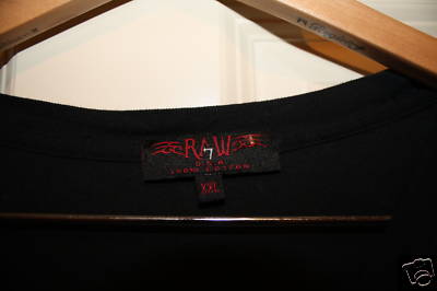 This is a stylish long sleeve Rocker style RAW black t-shirt. It has a really cool skull and wing design embroidered (not screen printed) on the back and sleeves.
