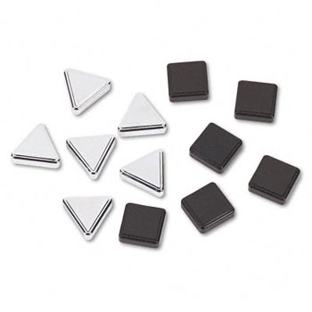 Contemporary magnets highlight posted information. Clear plastic storage container includes six each of silver triangles and metallic black squares. Character Types: Squares; Triangles; Mounting Type: Magnetic; Character Style: N/A; Character Color: Black; Silver.