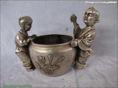 China Silver carved Boys and girls in the jar Pot to catch fish lovely statue