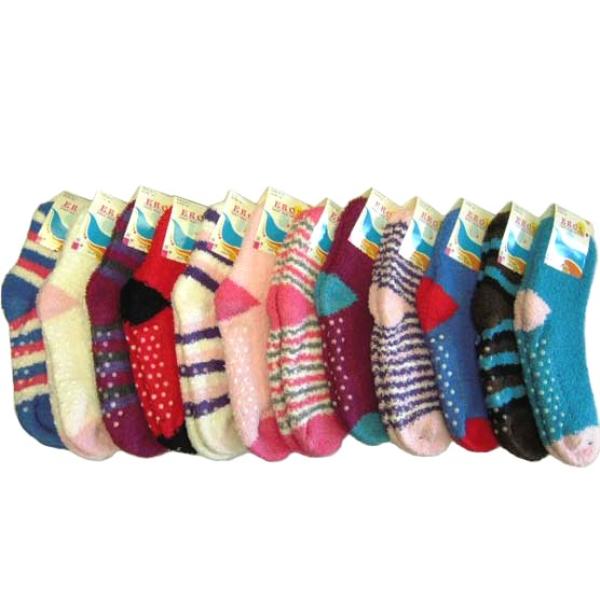 Wholesale Women's Striped Fuzzy Socks with non skid grips come in size 9-11 (fits shoe sizes 4-10.5). These socks come in assorted striped patterns and heel & toe colors. Each pair comes individually tagged with 3 pairs per band. 80% polyester 10% nylon and 10% spandex. One unit equals one pair."" Case Pack 120  Please note: If there is a color/size/type option the option closest to the image will be shipped (Or you may receive a random color/size/type).