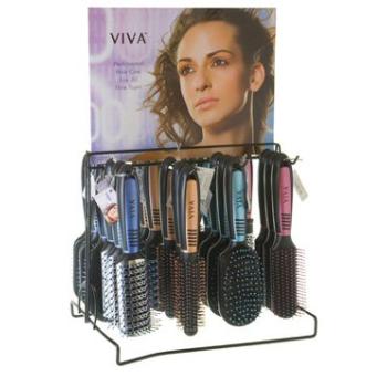 Viva Professional Hairbrush. Assorted Colors and shapes of these wholesale cheap bulk discount hair brushes. Hair brushes are on a metal display rack. Case Pack 144 Please note: If there is a color/size/type option the option closest to the image will be shipped (Or you may receive a random color/size/type).