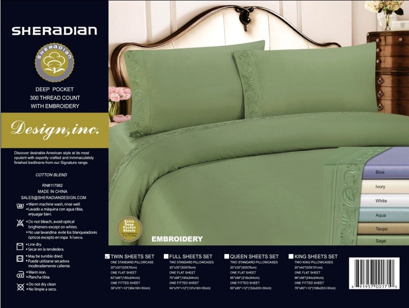The secret to great style is a good nights sleep and this luxurious deal gets the job done right. Experience the ultimate in comfort and savings with this fantastic 300 thread count cotton sheet set from Sheradian. Choose your size color and get ready to relax in sophisticated style that really delivers. Count sheep while you count your savings snuggled away in luxury. Want to know more? • Each set includes two standard pillow cases one flat sheet one fitted sheet • Features classic embroidered pattern to add texture and timeless style to your bedroom dcor • Wide range of colors to suit master bedrooms as well as guest rooms • Soft cotton-blend material keeps you cozy; 300 thread count • Colorful collection of Sheradians Signature collection"" Case Pack 6 Please note: If there is a color/size/type option the option closest to the image will be shipped (Or you may receive a random color/size/type).