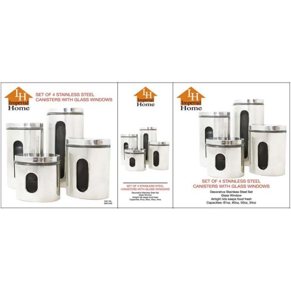 4 Piece Oval Glass Canister Set with Open Window Display Sizes: 81 oz. 60 oz. 50 oz. 34 oz. Case Pack 4 Please note: If there is a color/size/type option the option closest to the image will be shipped (Or you may receive a random color/size/type).